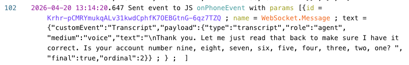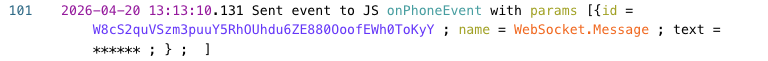 Если для WebSocket-клиента установлено значение privacy: true, Voximplant заменяет поле text каждого события WebSocket.Message на ****** в логах перед их сохранением. Ваш сценарий продолжает получать исходное содержимое сообщения во время выполнения, поэтому транскрипты, логика агента и последующая обработка работают без изменений.